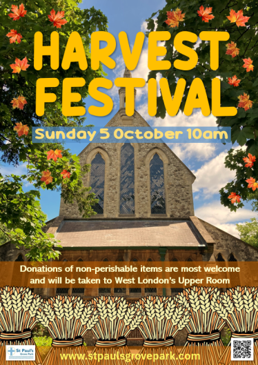 During our Harvest celebration we will be taking a food collection for the wonderful Upper Room charity in Shepherd's Bush which supports homeless and vulnerable