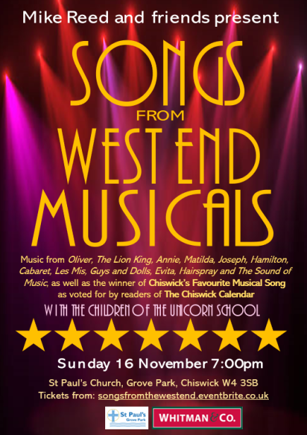 Join us for an evening of razzamatazz and all that jazz, as Mike Reed is joined by an array of talented stars, to perform songs from some of the best-loved West End musicals, including Oliver, The Lion King, Annie, Matilda, Joseph, Hamilton, Cabaret, Les Mis, Guys and Dolls, Evita, Hairspray and The Sound of Music. We are excited to welcome The Unicorn School choir conducted by Rebecca Gresson back to St Paul’s, and the fabulous music will also include a performance of the winner of Chiswick’s Favourite Musical Song as voted for by readers of The Chiswick Calendar.
