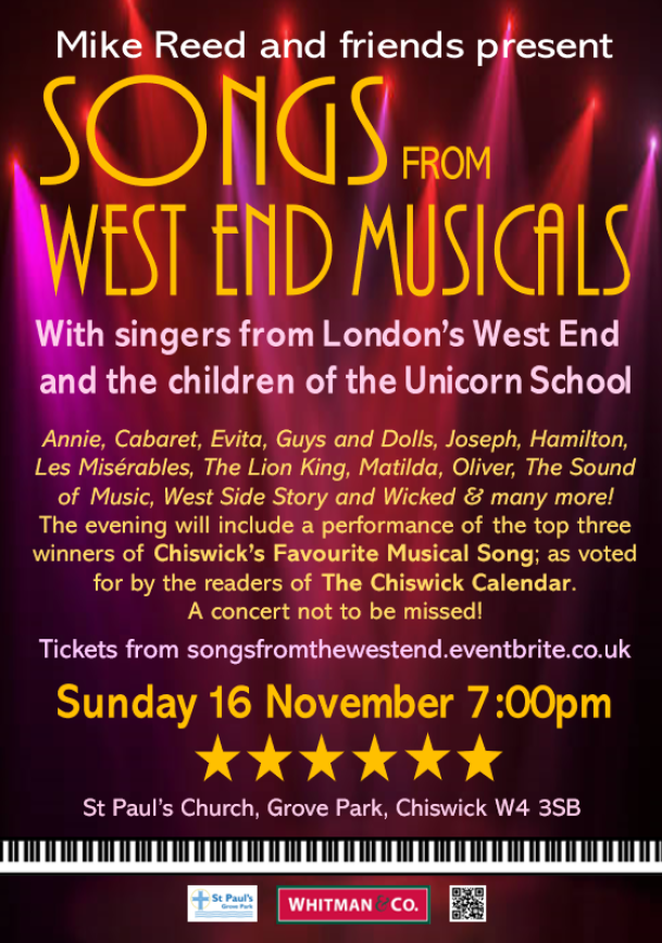 Join us for an evening of razzamatazz and all that jazz, as Mike Reed is joined by an array of talented stars, to perform songs from some of the best-loved West End musicals, including Oliver, The Lion King, Annie, Matilda, Joseph, Hamilton, Cabaret, Les Mis, Guys and Dolls, Evita and The Sound of Music. We are excited to welcome The Unicorn School choir conducted by Rebecca Gresson back to St Paul’s, and the fabulous music will also include a performance of the winner of Chiswick’s Favourite Musical Song as voted for by readers of The Chiswick Calendar.