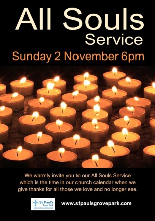 On Sunday 2nd November at 6pm we’ll hold our All Souls Service of prayers and readings to remember and give thanks for those we love and see no more. If you would like us to remember a loved one, please either email me or sign the sheet at the back of church.