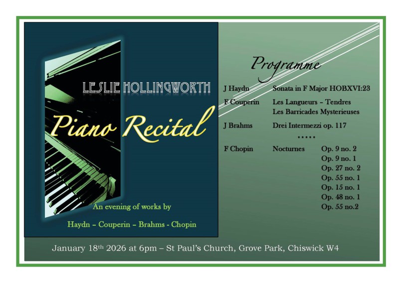 Renowned pianist Leslie Hollingworth will present a programme of music by Haydn, Couperin, Brahms and Chopin. Entry to the concert is free; donations to cover
