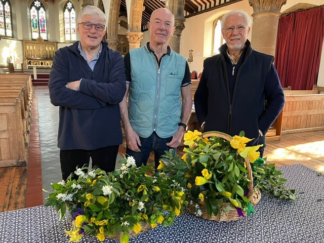 Simon, Adam and Keith making up posies for the Mothering Sunday service, using greenery from the St Paul's garden.