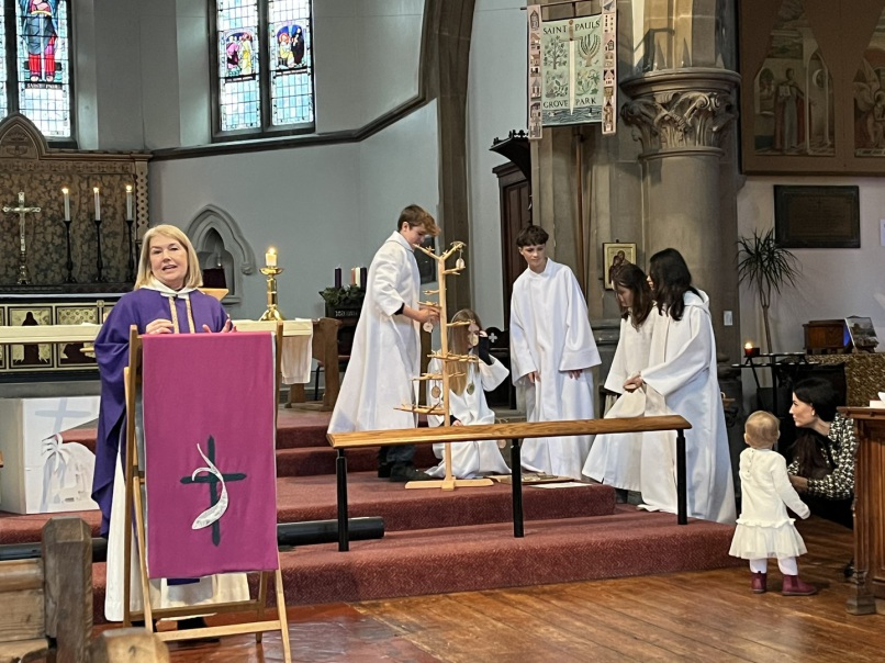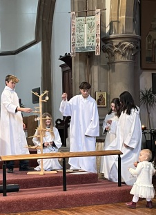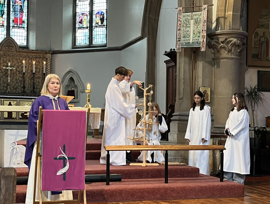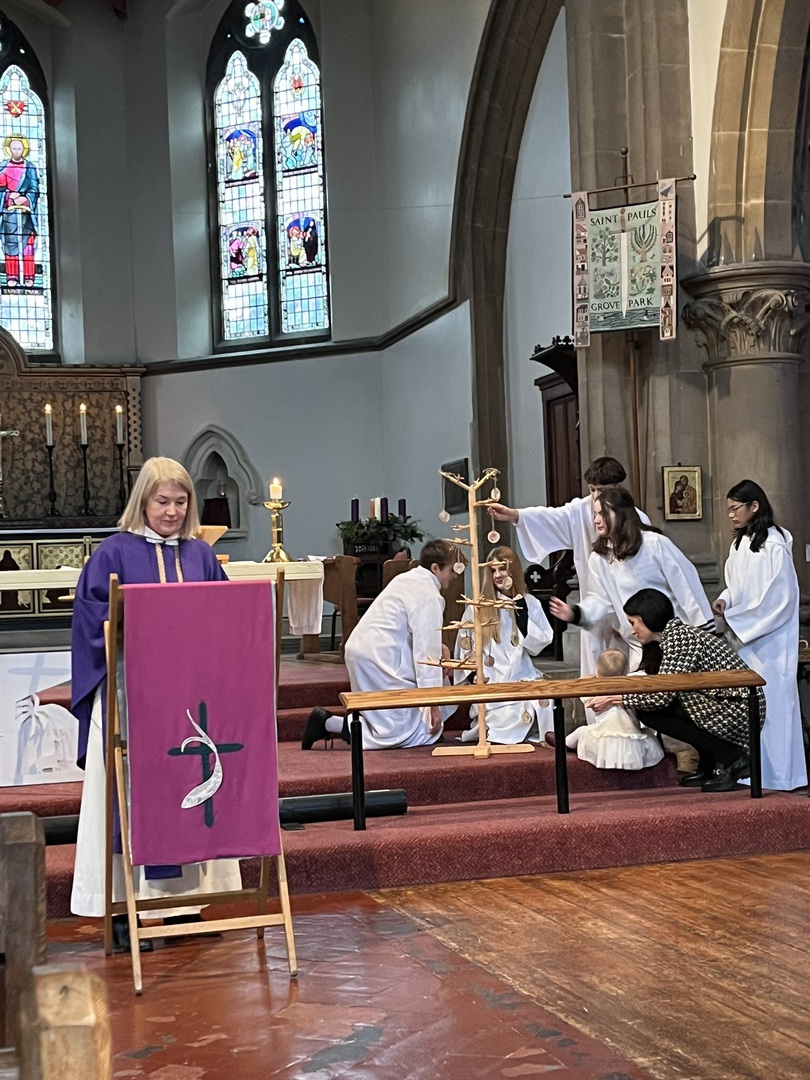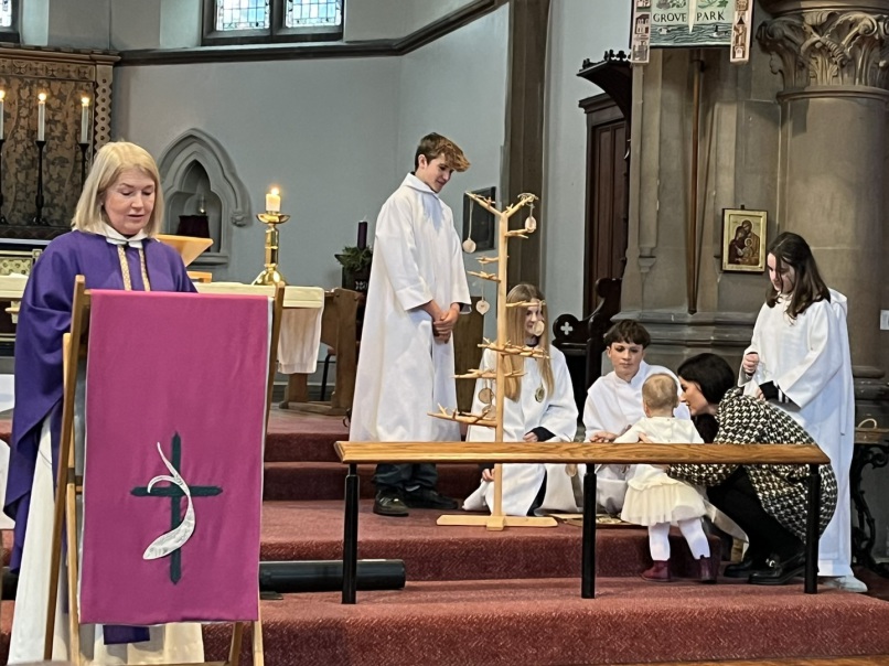 The Youth Group decorating the Jesse Tree in December 2025, watched by newly baptised Charlotte!